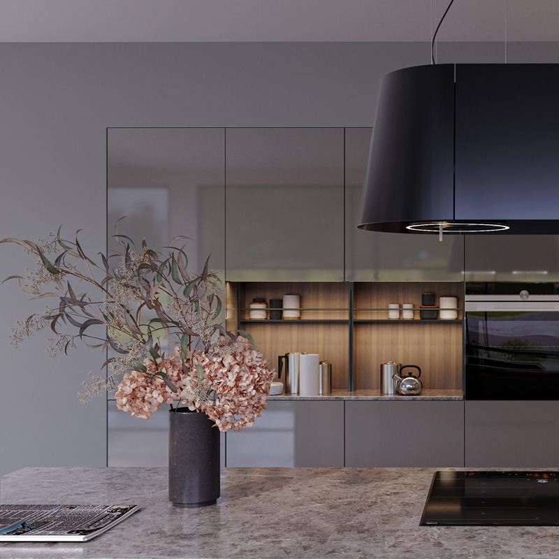Η νησίδα “βγαίνει” μέσα από την κυρίως κουζίνα, δημιουργώντας το χώρο μαγειρέματος, προσφέροντας επιπλέον λειτουργικό χώρο με την τοποθέτηση ντουλαπιών στην εξωτερική της πλευρά.
