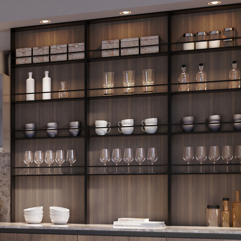 Oι ραφιέρες με πλάτη στο χρώμα του ξύλου, αναβαθμίζουν το αισθητικό αποτέλεσμα και κάνουν πιο εύκολη την πρόσβαση σε μπαχαρικά και μυρωδικά κατά τη διάρκεια της παρασκευής φαγητού ενώ λειτουργούν και ως διακοσμητικό στοιχείο.