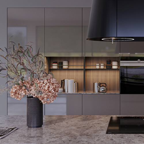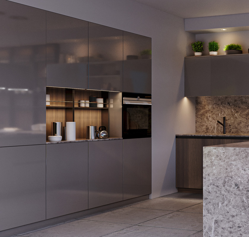 Οι επιφάνειες με την εντυπωσιακή, μπεζ μεταλιζέ λάκα στην Mosaiko μπορούν να ενταχθούν σε ολόκληρη την κουζίνα δημιουργώντας ένα έντονο αποτέλεσμα ή να χρησιμοποιηθούν σε συνδυασμό με άλλα υλικά όπως το ξύλο που παρουσιάζεται σε αυτή την σχεδιαστική πρόταση.