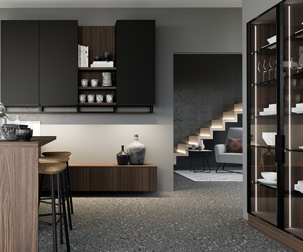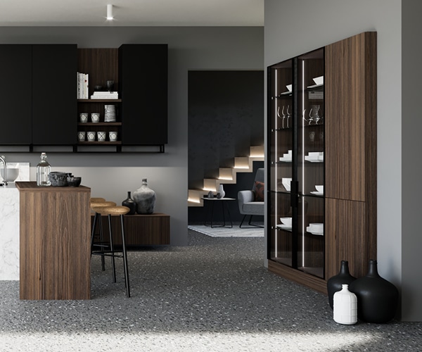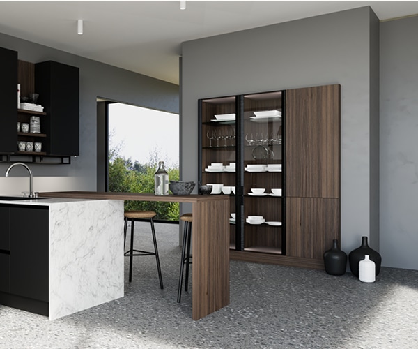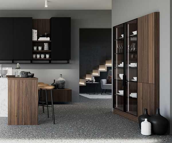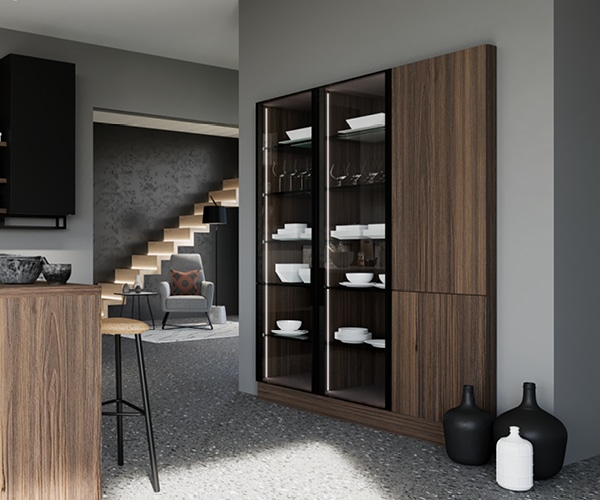 Οι ψηλές αποθηκευτικές βιτρίνες με φωτισμό LED, προσδίδουν επιπλέον αισθητική και μία πιο elegant διάθεση, αποδεικνύοντας ότι η κουζίνα πέραν της λειτουργικότητας και της εργονομίας, μπορεί να προσφέρει και φινέτσα.