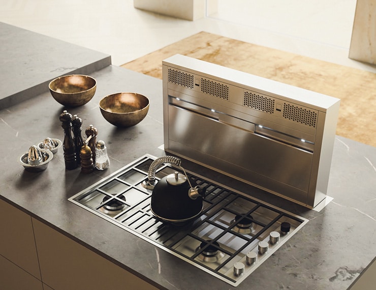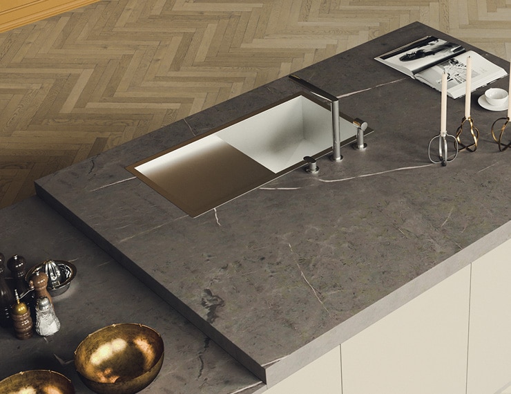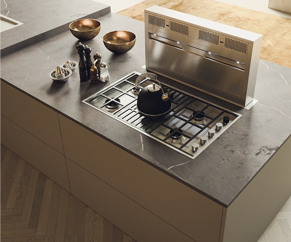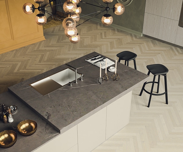 Το πάχος της επιφάνεια της νησίδας παρουσιάζει διαβαθμίσεις και επεκτείνεται, χωρίζοντας έτσι, διακριτικά, τον χώρο παρασκευής από τον χώρο προετοιμασίας και σερβιρίσματος.
