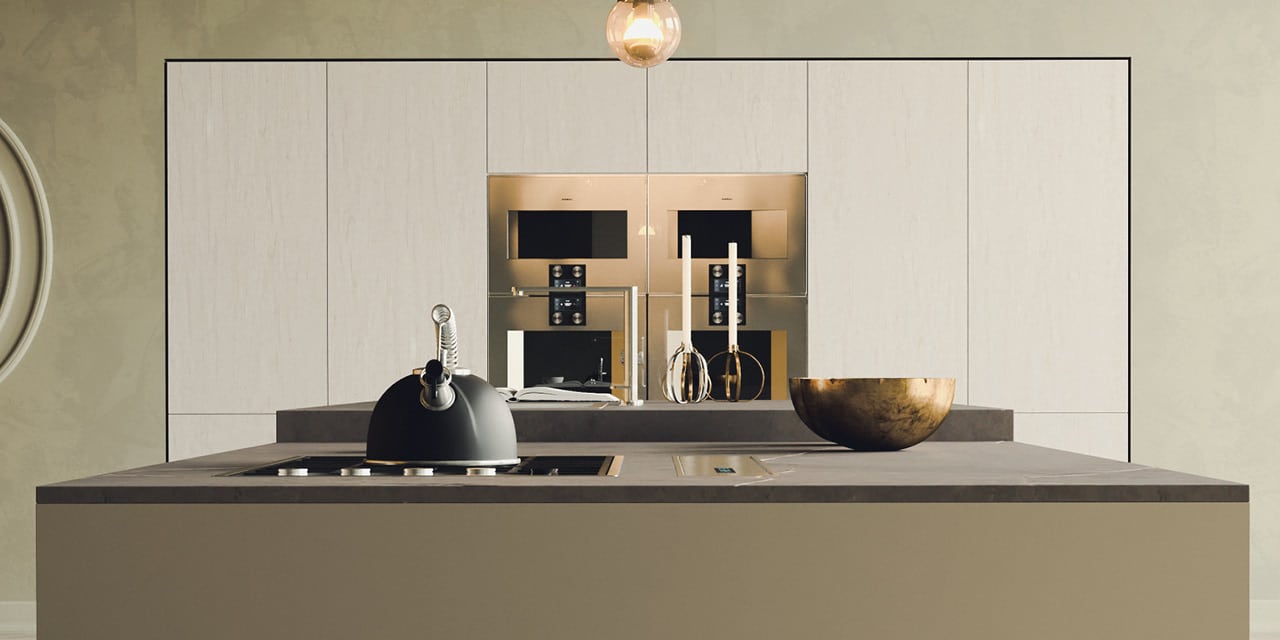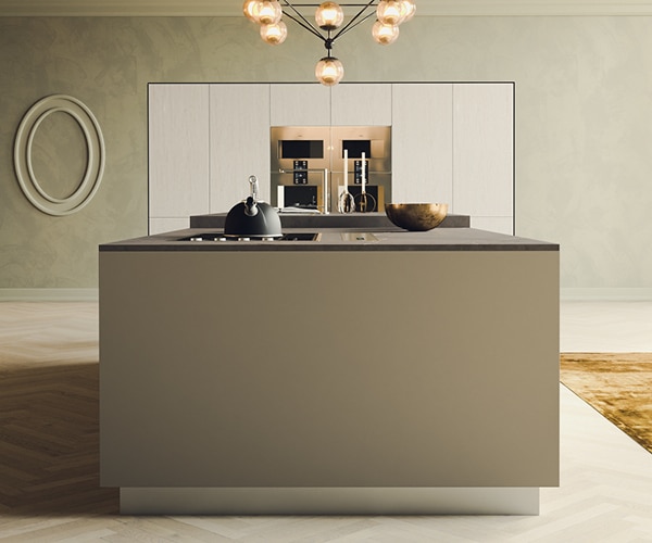 Υψηλές μονάδες με κάθετα νερά, σε φυσική, ανοιχτή απόχρωση ξύλου συνυπάρχουν αρμονικά με super matt, όψεις σε παλ χρωματισμούς οι οποίες περιβάλλουν την κεντρική νησίδα της σύνθεσης.